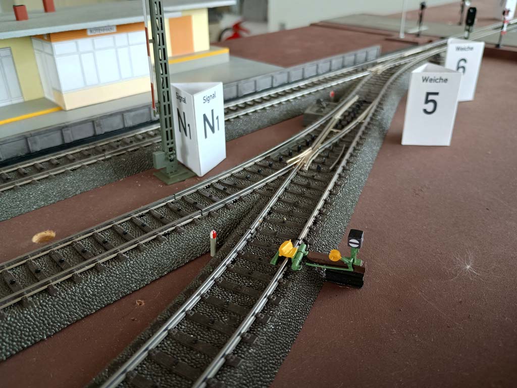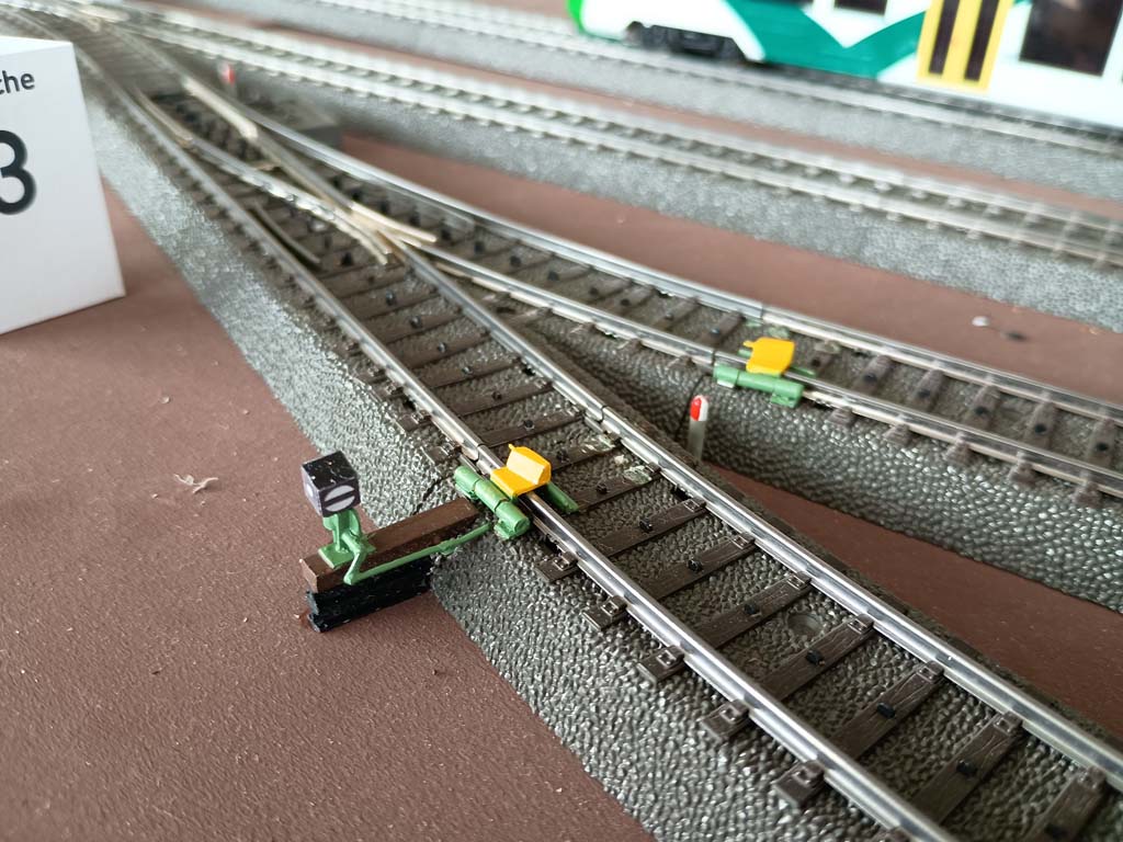 Hier sehen wir die Gleissperre "Gs I". Diese doppelte Gleissperre wurde beim Vorbild vom Stellwerk aus bedient. Im Modell sind die Sperrklötze und die Laterne per Hand drehbar. Eine Ansteuerung durch die Hebelbank ist (noch) nicht möglich.