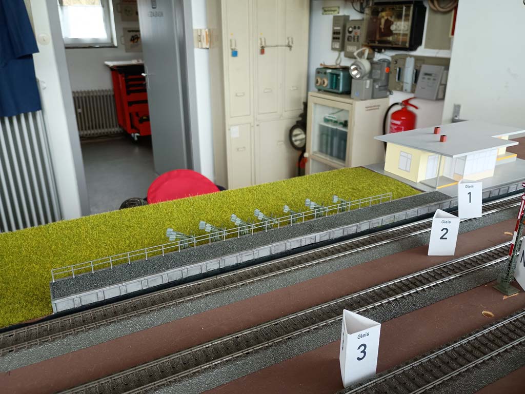 Im Bahnhof wurden an der Modellbahnplatte selbst gebastelte Gleissperren installiert, sowie eine Stellprobe des in Heimarbeit erstellten Moduls mit dem Bahnsteig und den Spannwerken durchgeführt.