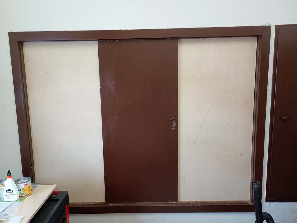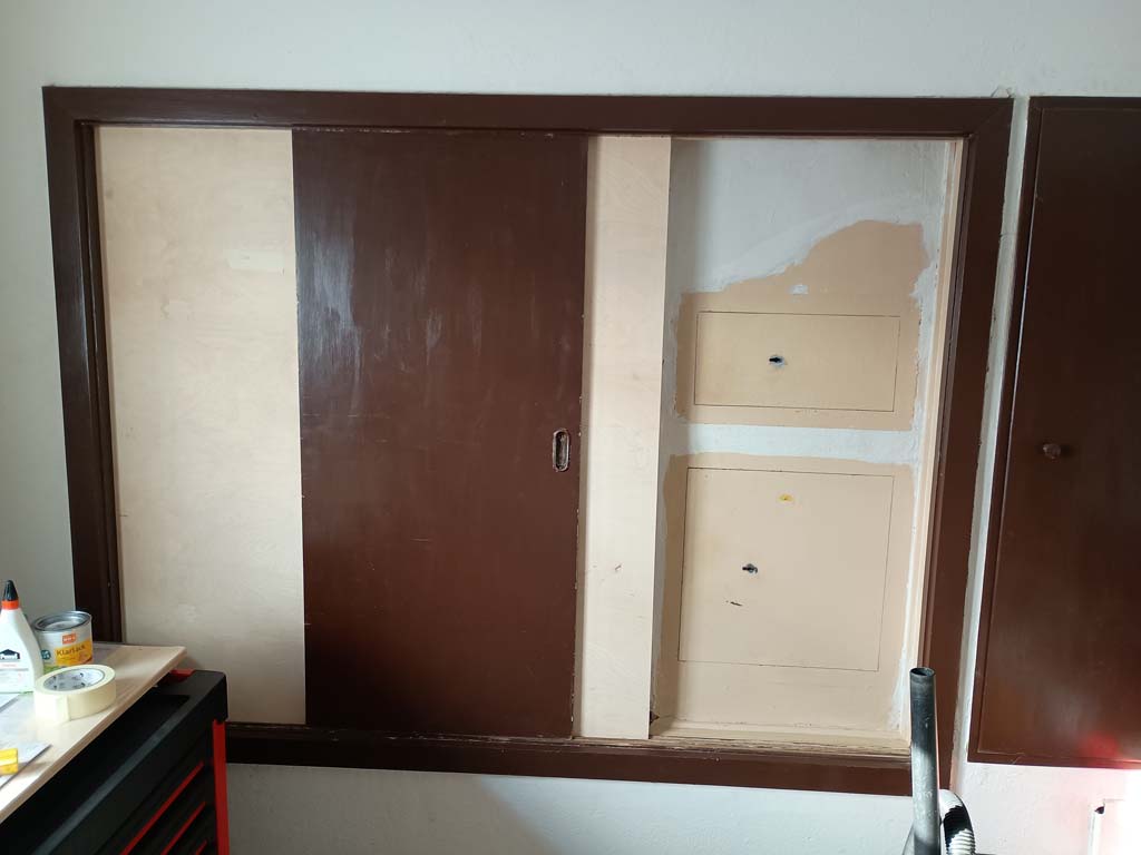 Im Sozialraum fehlen bei dem Wandschrank zwei der drei Schiebetüren. Die beiden fehlenden werden in Heimarbeit angefertigt, an diesem Tag fand eine erste Anprobe statt.
